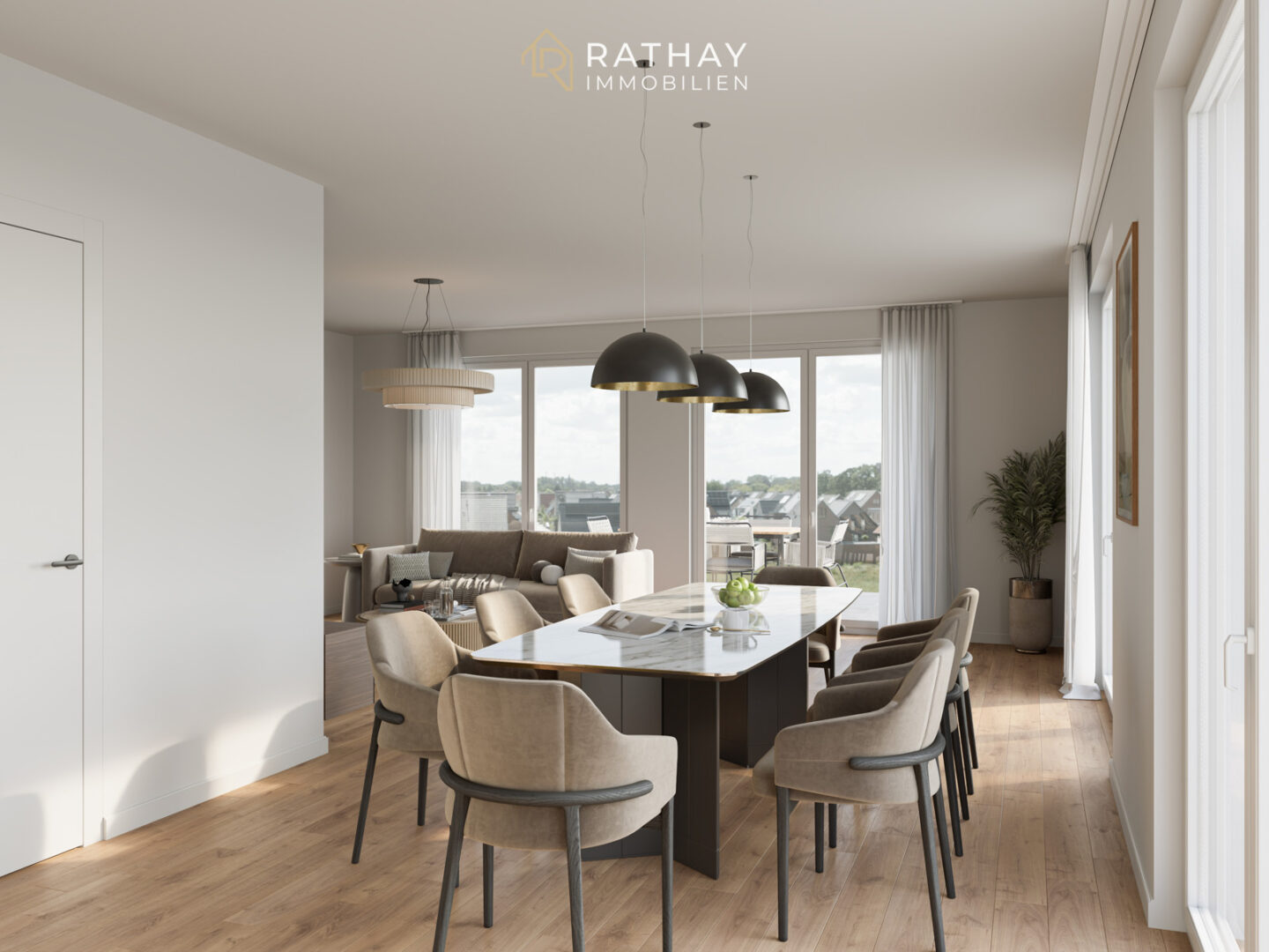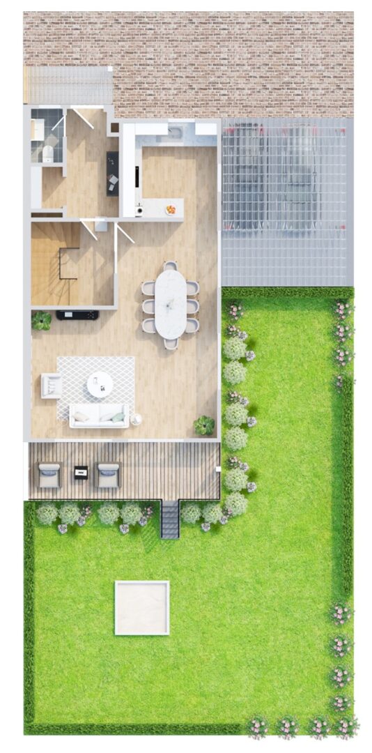 Das Erdgeschoss empfängt mit einem weitläufigen Wohn- und Essbereich, der durch seine Offenheit und Helligkeit besticht. Hier schließt sich eine traumhafte Terrasse mit rund 20,42 Quadratmetern Fläche an – ideal für gesellige Stunden im Freien oder entspannte Sommerabende.