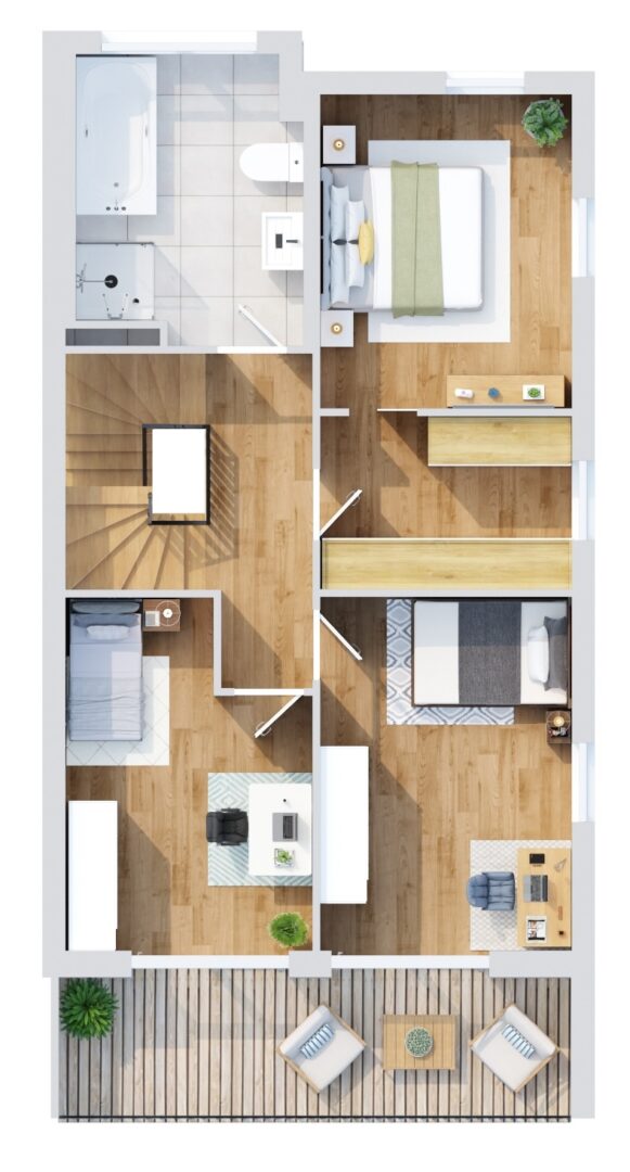 Je nach Ausbaustufe verfügen die Doppelhaushälften über Wohnflächen zwischen ca. 137,42 und 197 Quadratmetern. Besonders attraktiv ist das ausbaufähige Dachgeschoss, das als exklusiver Studiobereich genutzt werden kann – beispielsweise als großzügiger Elterntrakt mit eigenem Bad. Damit entstehen je nach Wunsch 4,5 bis 6,5 individuell nutzbare Zimmer, die sowohl Familien als auch anspruchsvollen Paaren ein Maximum an Flexibilität bieten.
