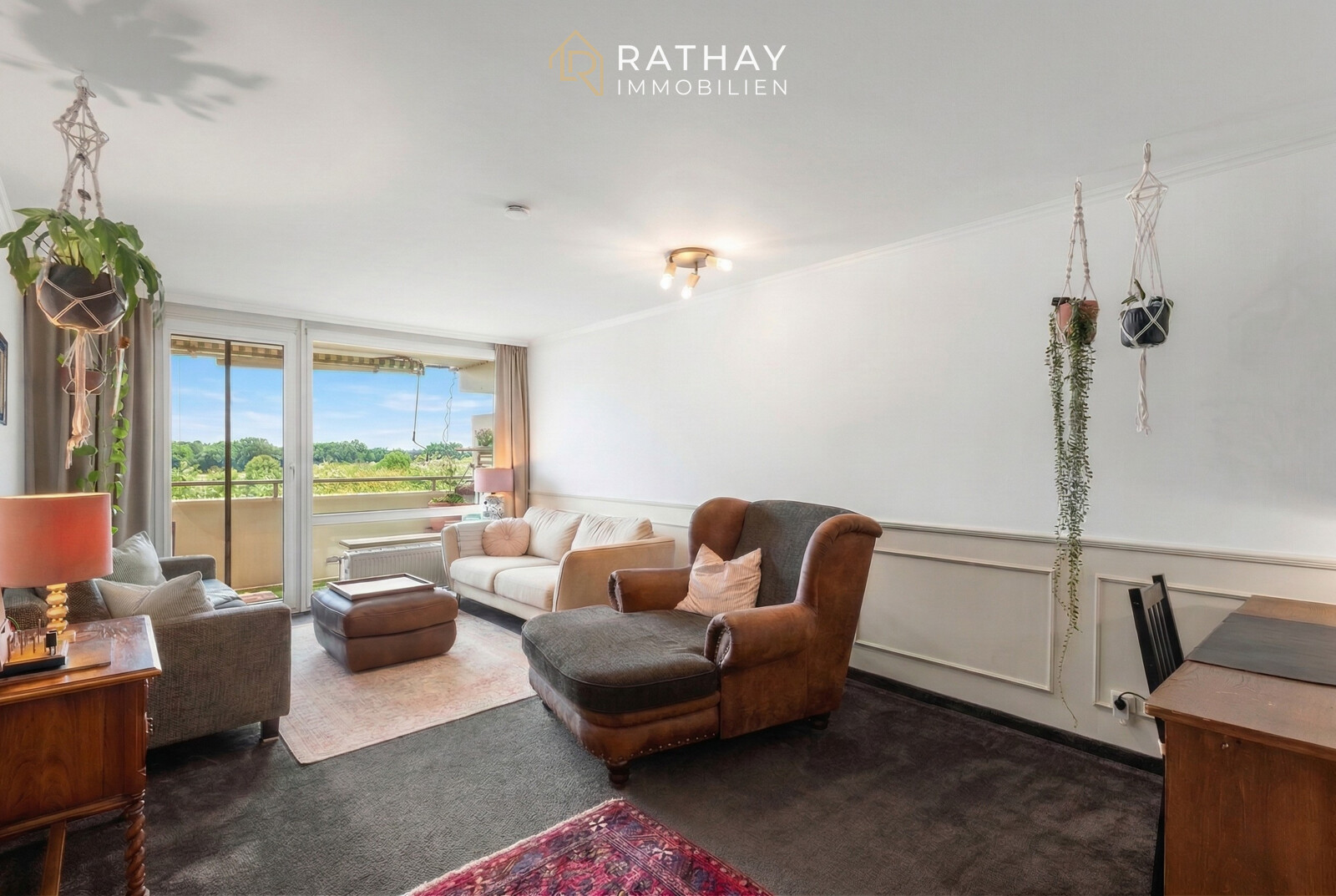 Vom Wohnzimmer aus gelangt man auf die nach Süden ausgerichtete Loggia, die mit Markise und Stromanschluss ausgestattet ist und einen schönen Platz bietet, um sonnige Stunden im Freien mit Blick ins Grüne bis zu den Bergen zu genießen. Zusätzlich steht ein Wintergarten zur Verfügung, der von den Schlafzimmern aus zugänglich ist und einen geschützten Außenbereich für ruhige Momente bietet.