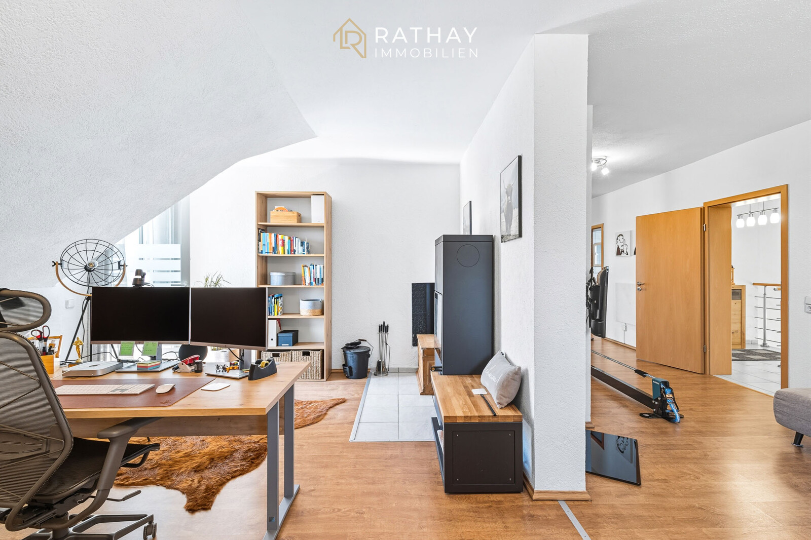 Schon beim Betreten des Hauses fällt das weitläufige Treppenhaus ins Auge, das den offenen Charakter des Hauses unterstreicht. Auf zwei Etagen verteilen sich fünf helle, großzügige Zimmer und zwei stilvolle Bäder, die sowohl Familien als auch Menschen mit dem Wunsch nach einem Mehrgenerationenwohnen oder der Option zur separaten Vermietung einer Etage begeistern werden.